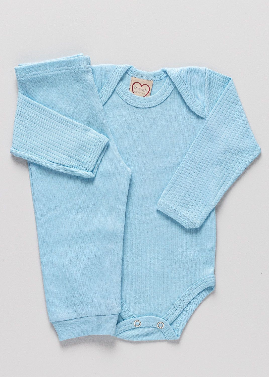 Conjunto body e calça canelados. O body possui decote em envelope que facilita a passagem da cabeça do bebê e fechamento embaixo com botão de pressão.