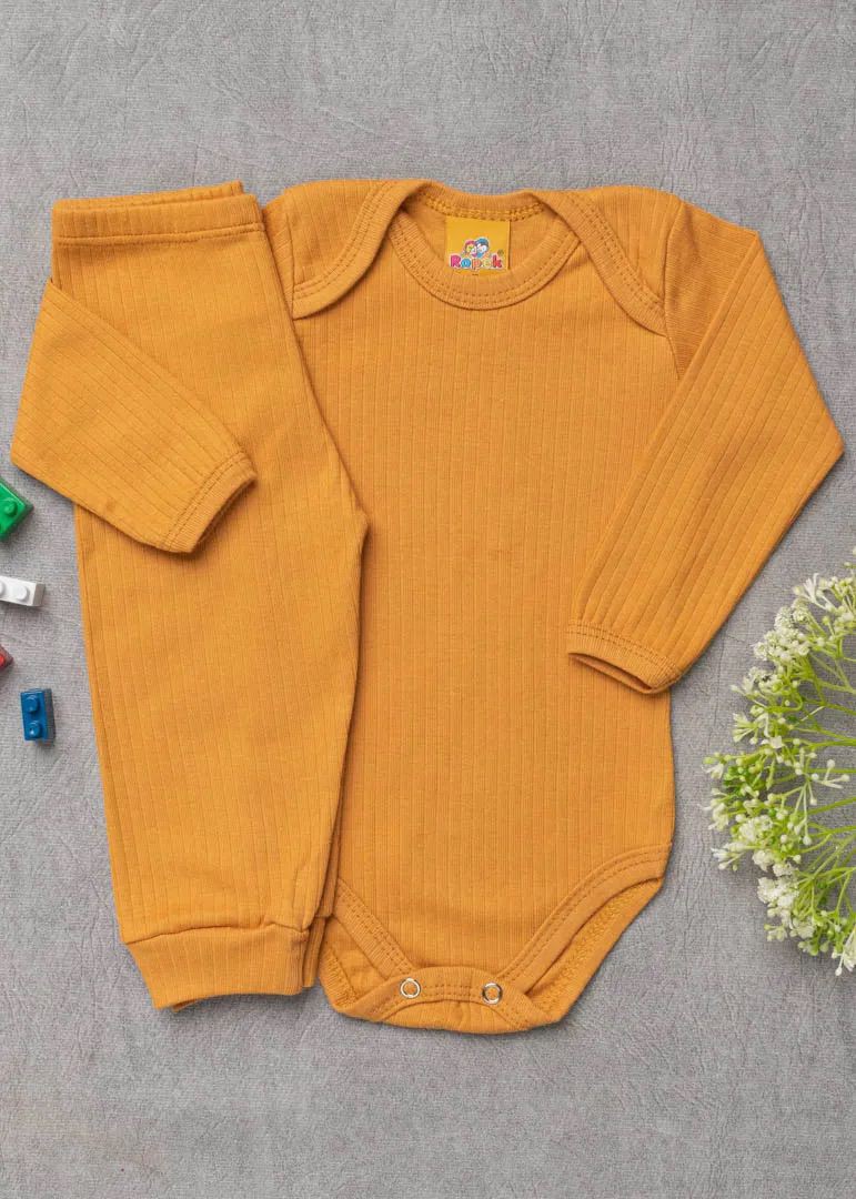 Conjunto body e calça canelados. O body possui decote em envelope que facilita a passagem da cabeça do bebê e fechamento embaixo com botão de pressão.