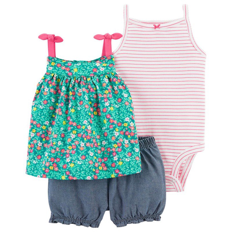 O Kit bebê 3 peças Carter's é confeccionado em malha de ribana o que permite que o body acompanhe o crescimento do seu bebê. Possui uma linda batinha/blusinha e short. Dá pra compor mais de um look lindo! É um kit super prático para ser utilizado no dia a dia do seu pequeno.