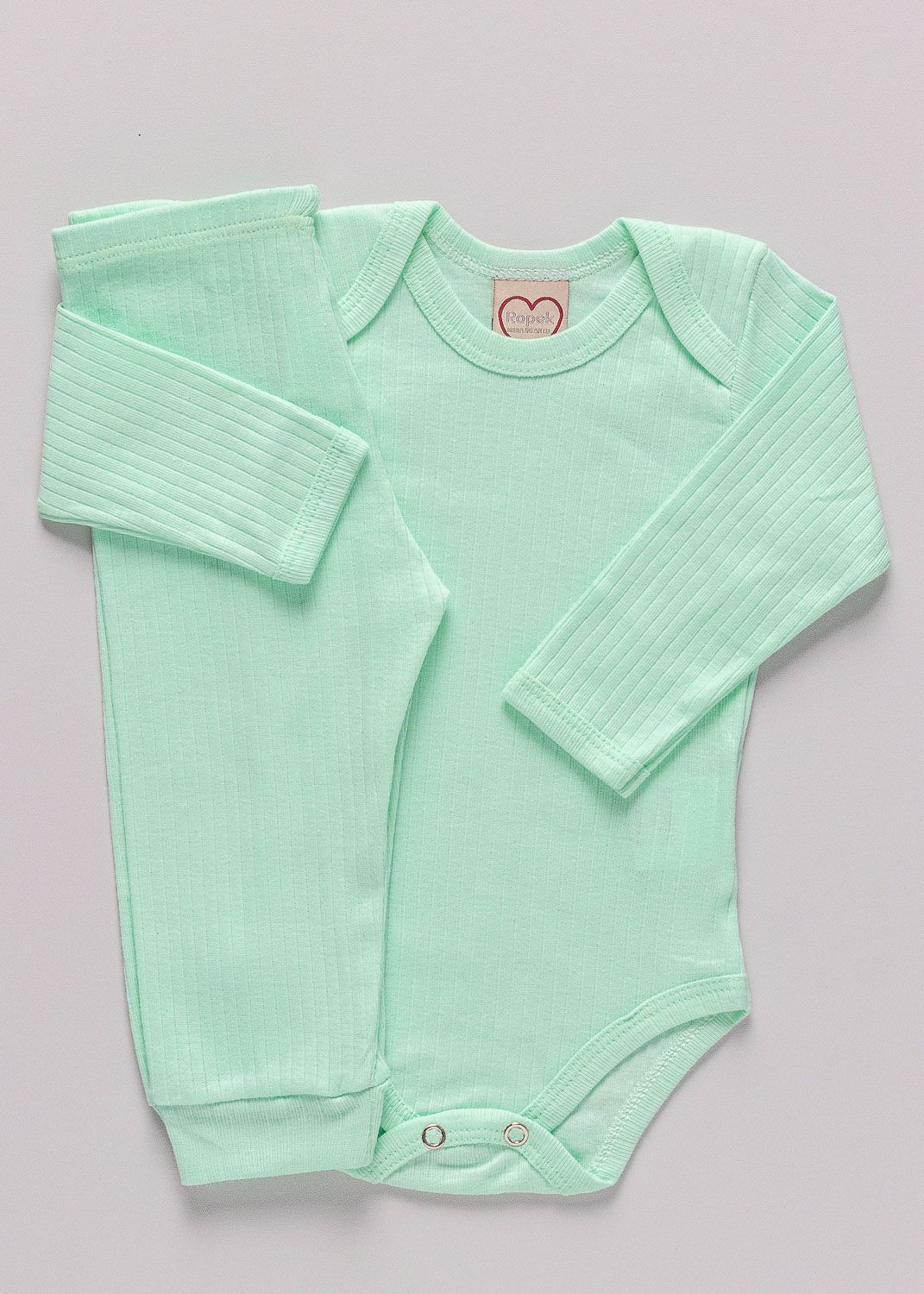 Conjunto body e calça canelados. O body possui decote em envelope que facilita a passagem da cabeça do bebê e fechamento embaixo com botão de pressão.